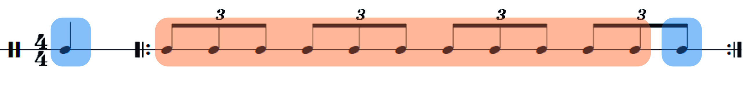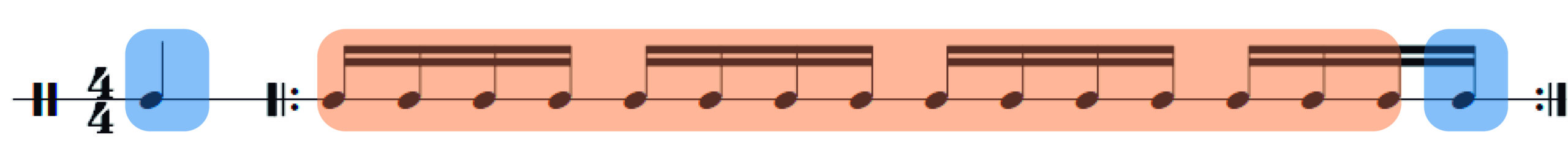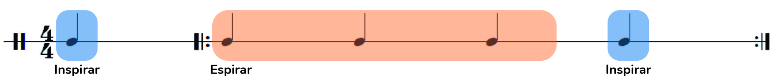• En un compás de 4/4, espiramos los tres primeros pulsos e inspiramos en el cuarto. Como hay que empezar con los pulmones llenos, incluimos una anacrusa de un pulso para inspirar. Con unas 3-5 repeticiones será suficiente.